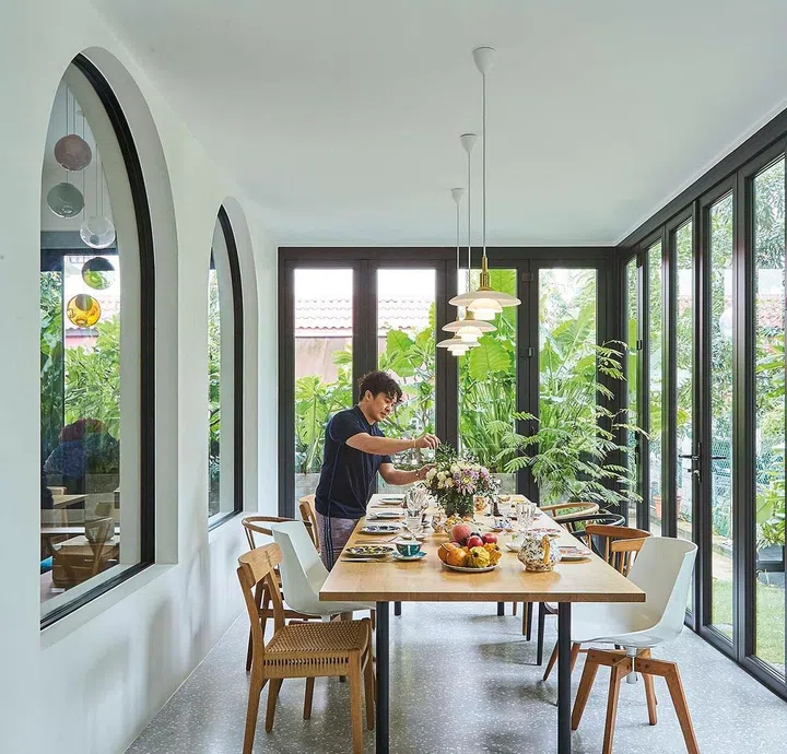 Dan and his team transformed it into a light-filled dining room fit for a lavish dinner party or casual brunch by adding full-height, foldable glass doors and opening up the adjacent wall with three arched openings and a doorway.