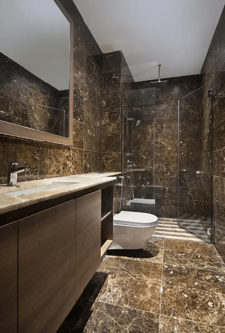 The ensuite bathroom, which features stone tiles with rich patterns and grains, exudes a luxury hotel atmosphere.