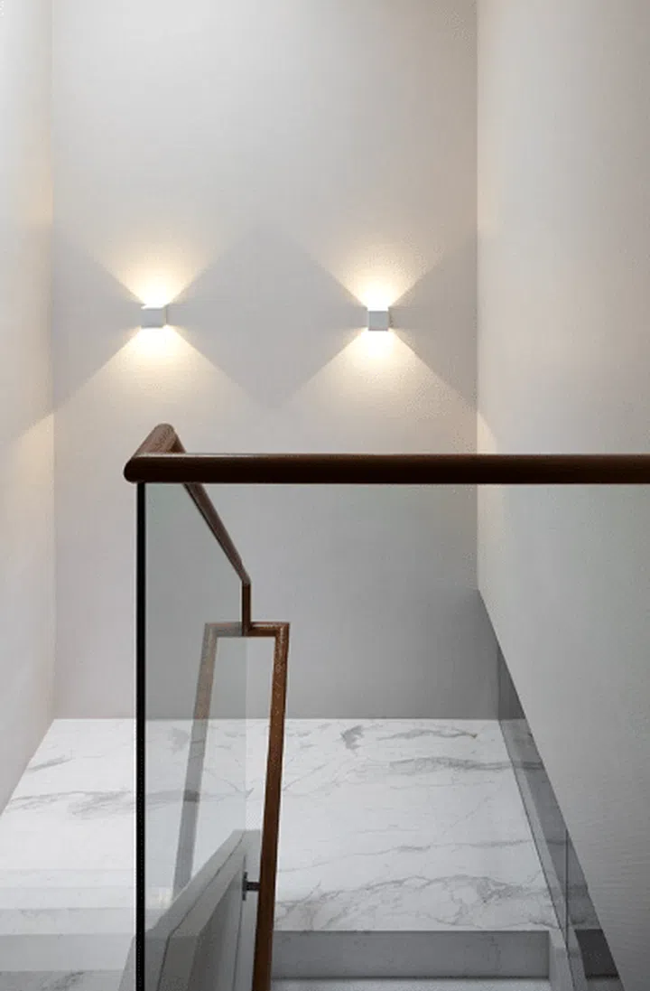 Let's take a look upstairs. Bridging the separate floors is a clean looking, airy, all-white and glass stairwell.