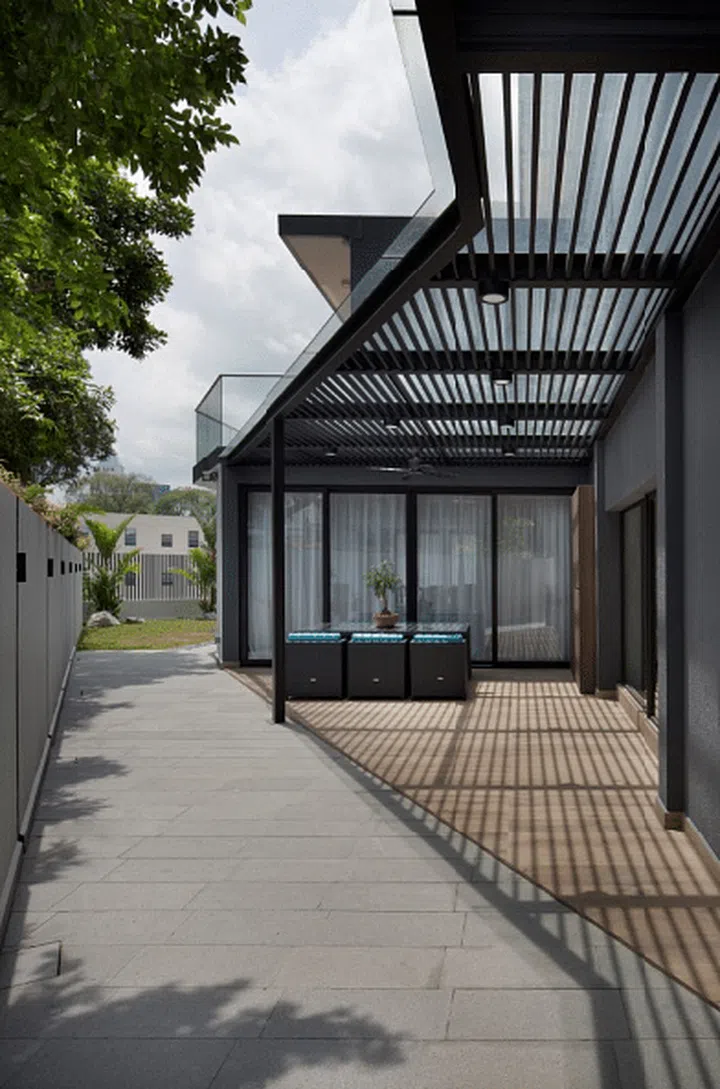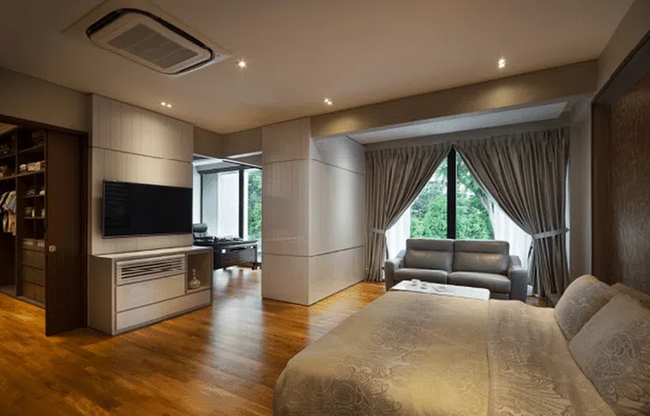 The 5,000 sq ft (464 sqm) landed property was designed by interior firm Prozfile, who incorporated many geometric features throughout the exterior and interior of the home.