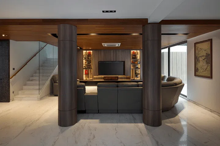 Despite the large floor space, the living room exudes a warm ambience thanks to the wood-clad pillars that flank the living room.