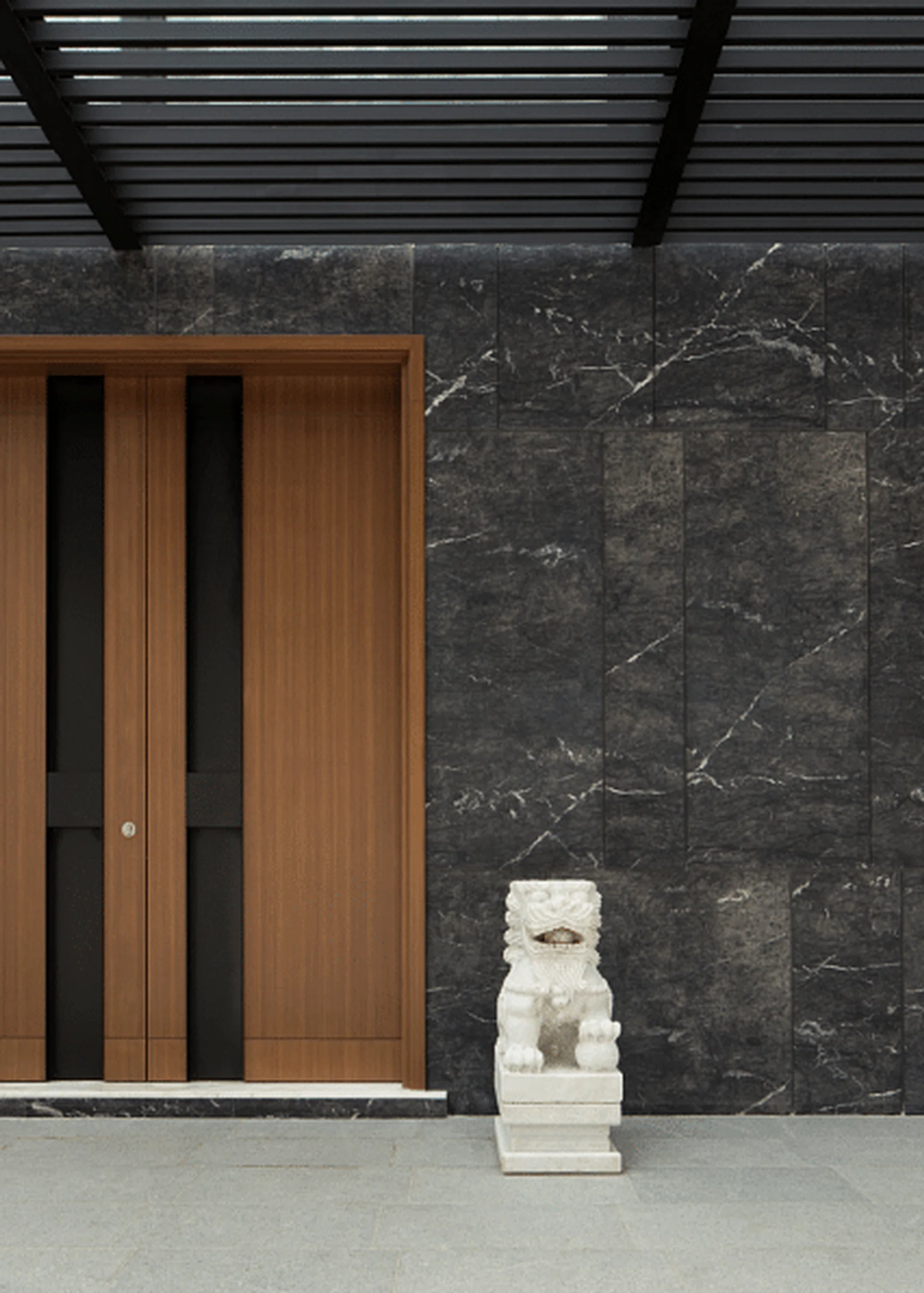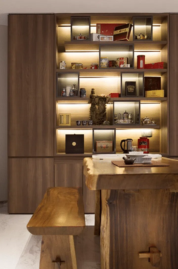 Tucked in a corner is an area specially designed for drinking Chinese tea. Instead of a modern contemporary look, the designers opted for a warmer and more traditional ambience with live-edge wood tables and cabinetry.