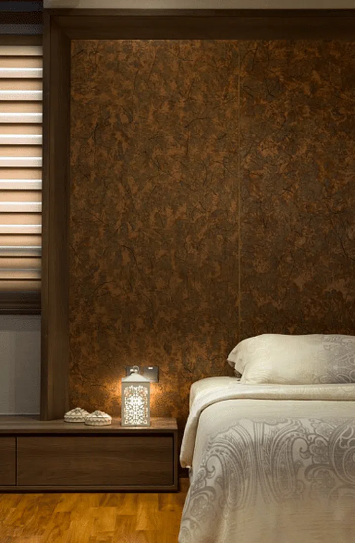To break the monotony of its earthy palette, the master bedroom was given a textured feature headboard. The built-in bedframe also comes with side tables.