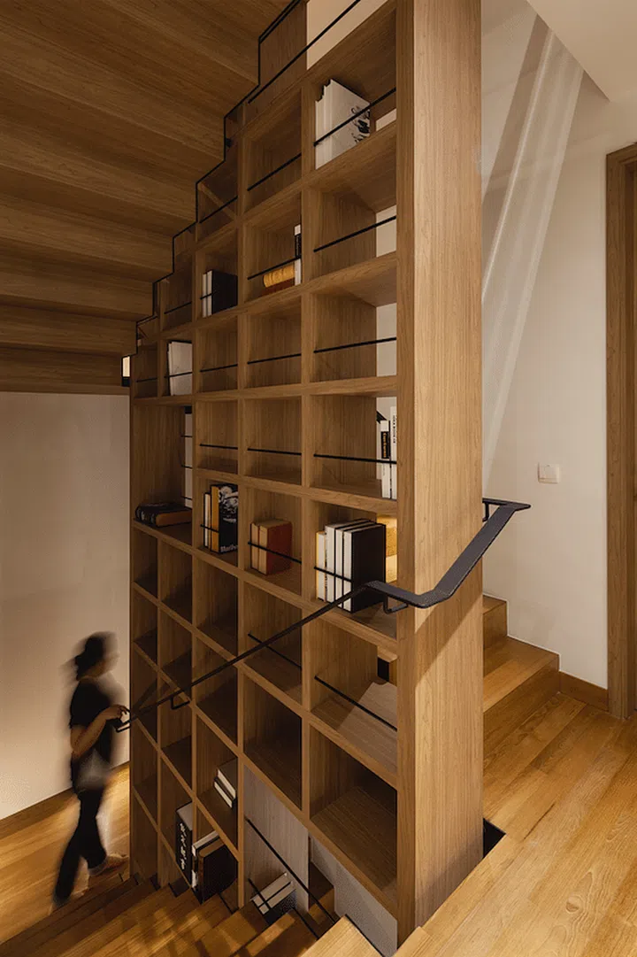 Kelvin replaced the conventional wall with a book tower instead; it extends upwards, with the staircase wrapped around it.