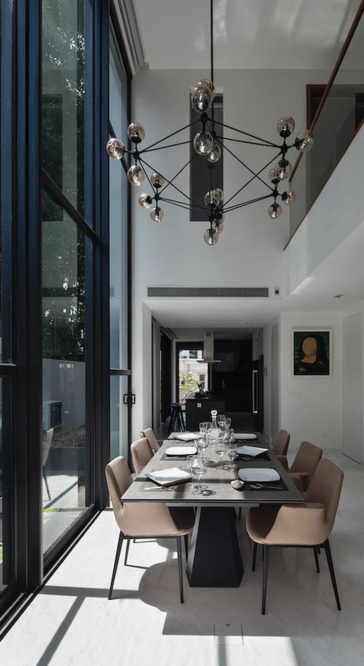 Complementing the vertical expanse of space are sliding glass doors that extend all the way up to the second floor. These full-height glass windows introduce plenty of natural light into the dining area.