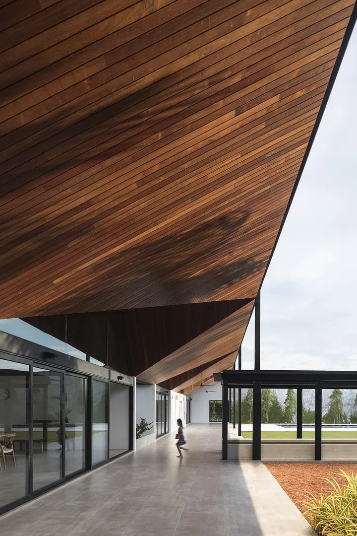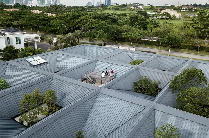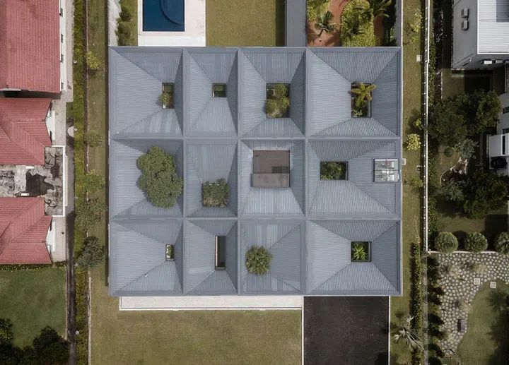 They had initially designed for the house to have conventional pitched roofs, but Kum Loon had the bright idea to flip the roof upside down, creating a series of funnel-like roofs, which are best seen from above.