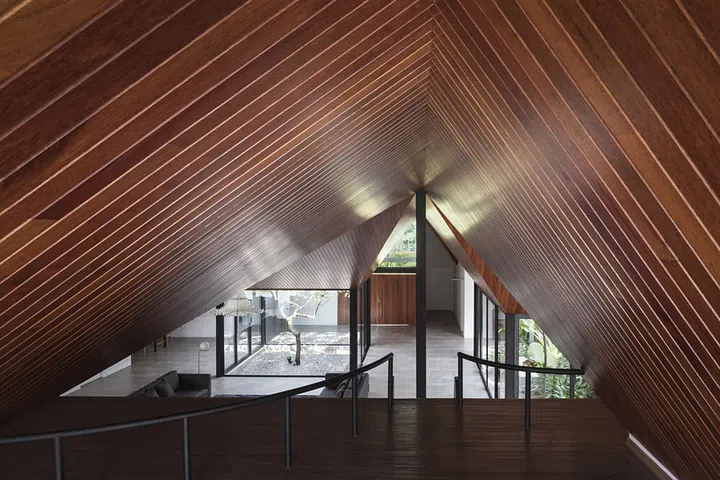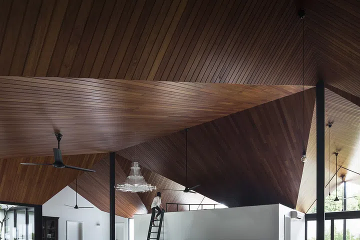 To give warmth to the home, the multi-faceted ceiling is made out of strips of chengal wood, which were assembled piece by piece by a craftsman who took 14 months to complete the job.