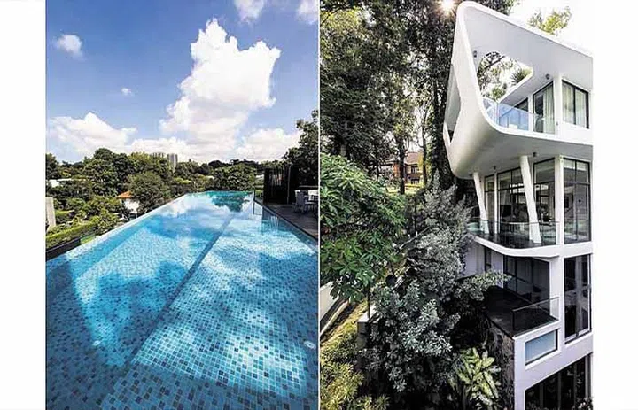 On the first floor is the swimming pool with vantage views of the neighbourhood, as well as the living, dining and kitchen.