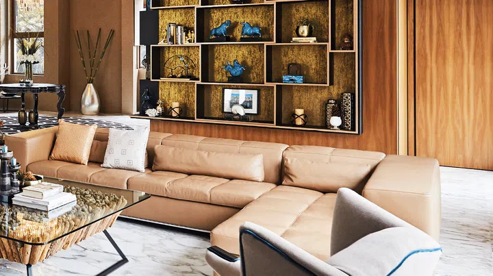 The expansive living area exudes an understated elegance. The Marquis sofa, Taylor B armchairs and rustic coffee table strike just the right balance between formal and casual, set against a book-matched marble feature wall backdrop. It is a space where you can get comfortable, but still elicits a certain degree of decorum.