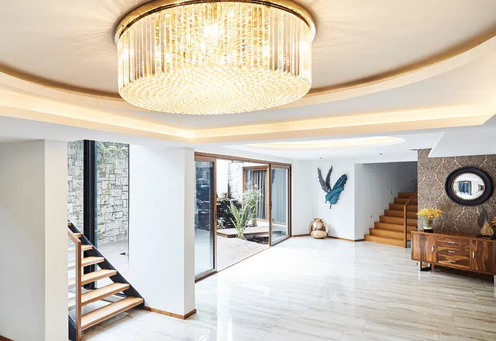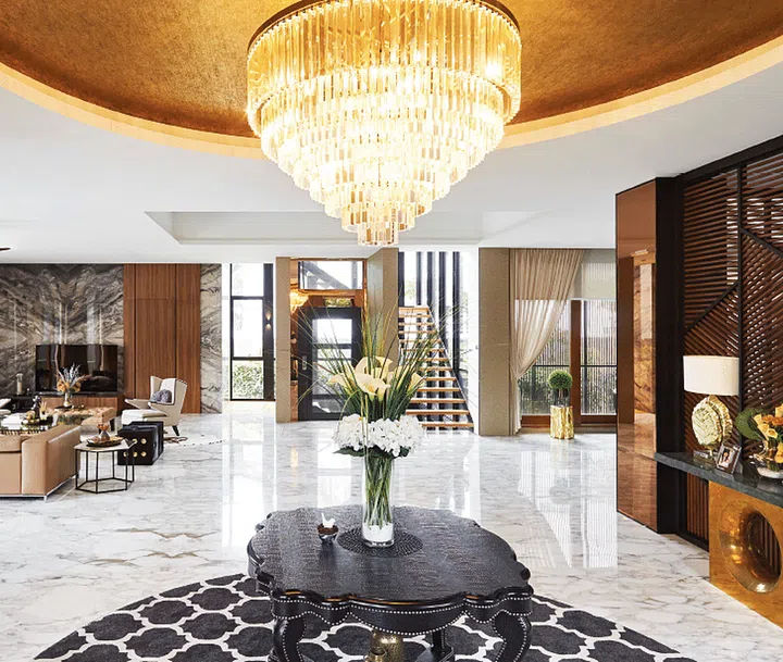 “I like the colour and the softer look of the veins,” she says. She had the pieces laid out on site to study the composition before finalising the actual arrangement. Making a grand statement at the entrance foyer is a bespoke crystal pendant light. Mdm Lim had it custom-made to the size that she wanted, which was larger that what was available in stores.