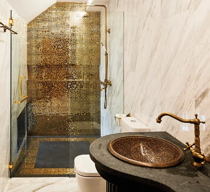 Each bathroom is uniquely decked out; featuring anything from chandeliers and book-matched marble to glittery gold mosaics.
