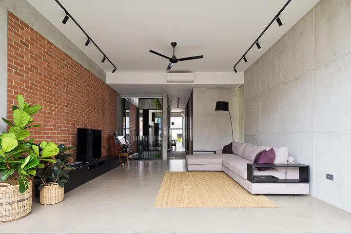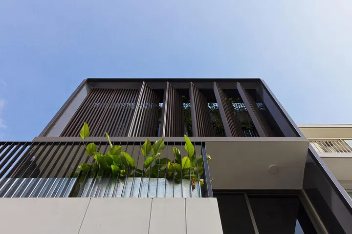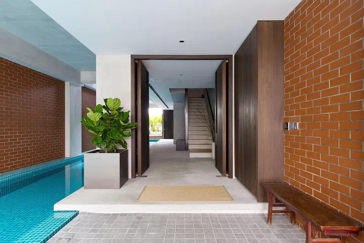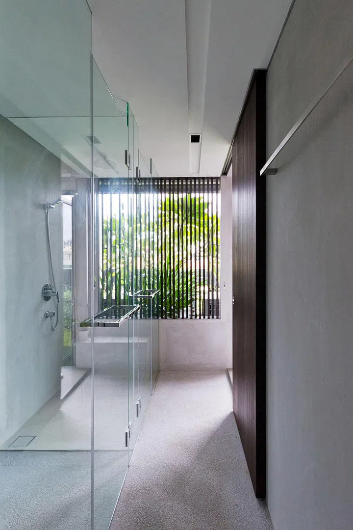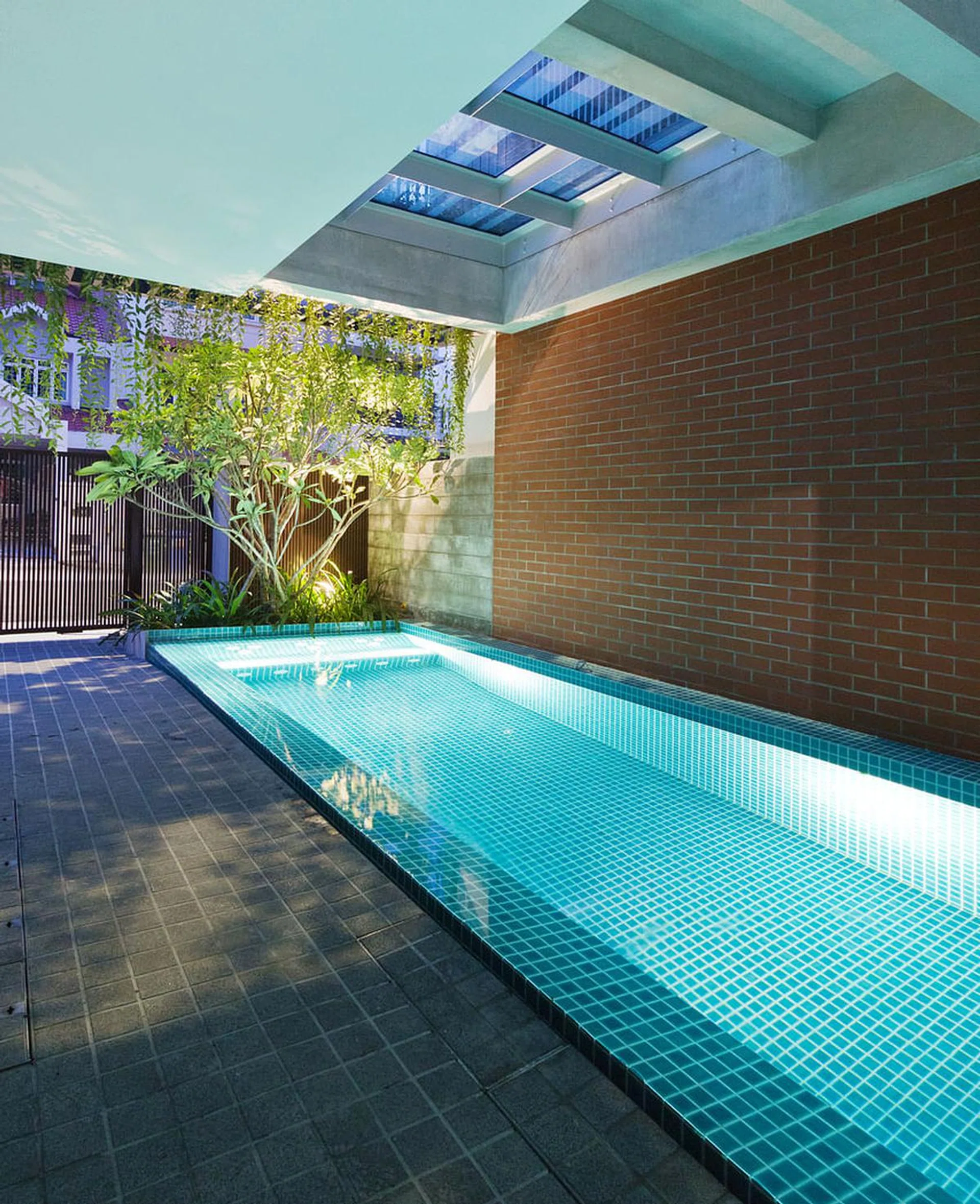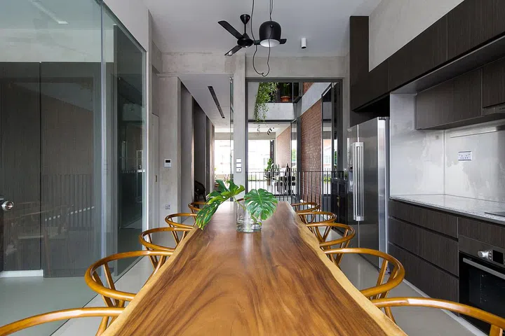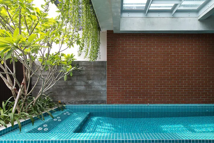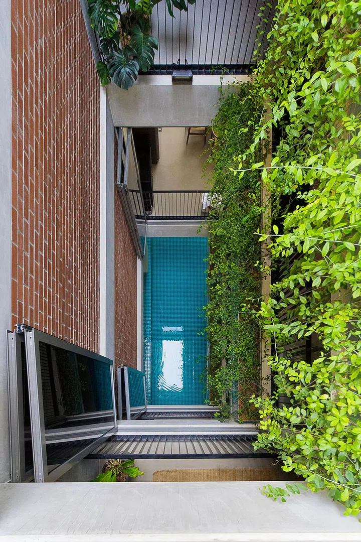 Although flanked by houses on both sides, the home is bright and well-ventilated, thanks to the four-storey air well that rises above the pool.