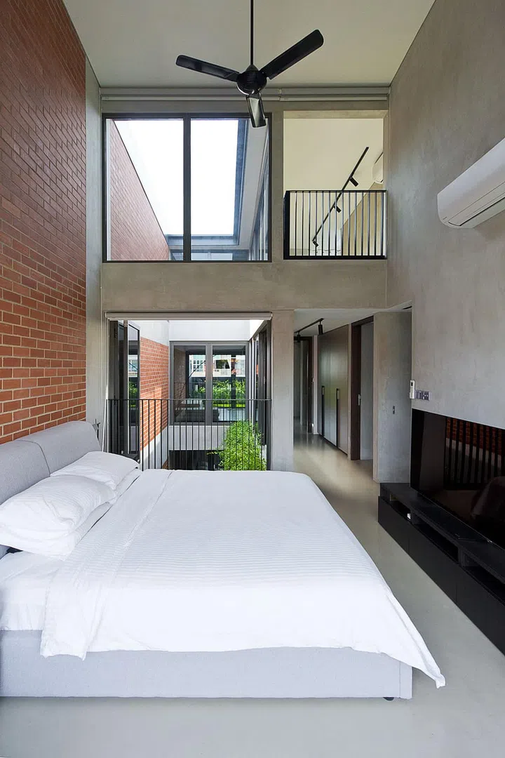 The air well is the focal point in that all the rooms face it. Each has slide-and-fold window walls so it gets adequate cross-ventilation and maintains a connection to the rest of the place.