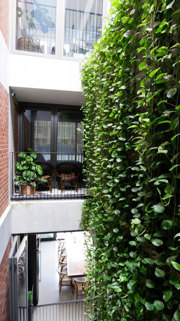 The air well also blurs the boundaries between the outdoors and indoors. Lush plants line its perimeter at each level, giving the appearance of a verdant green curtain.