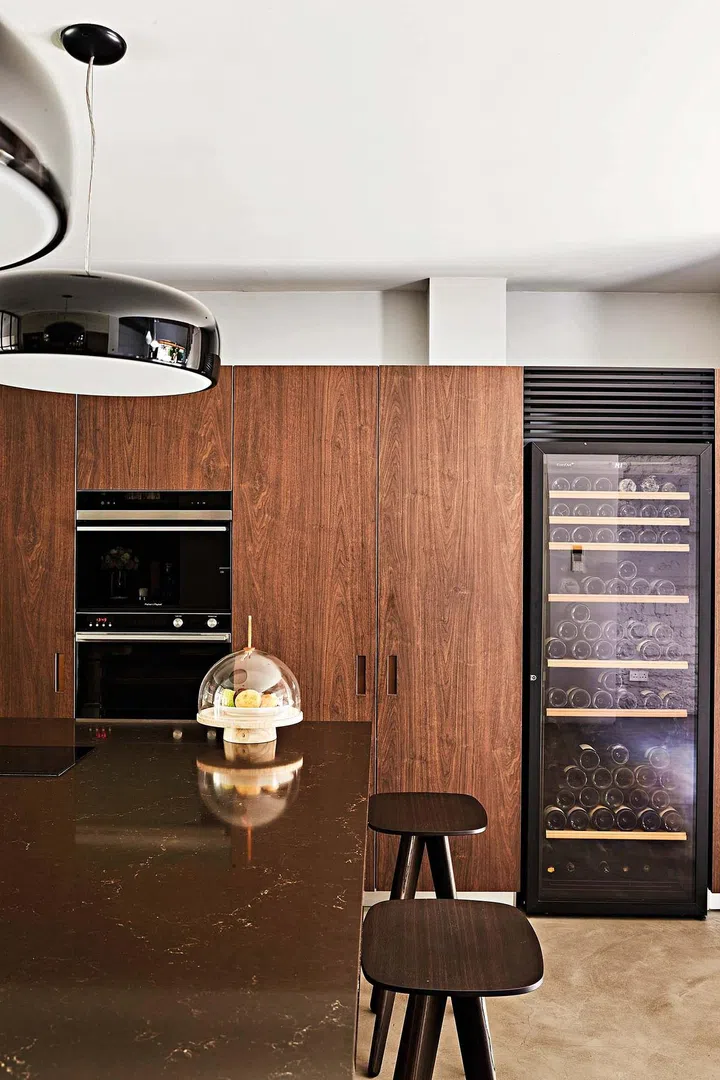 The materials and finishes throughout the rest of the home also maintain the mid-century theme and the homeowners’ preferences. The mosaics on the wet kitchen floor and bedroom balconies, for instance, are characteristic of the era, and the designers drew upon this to create geometric patterns in the powder room and on bathroom walls with tiles.
