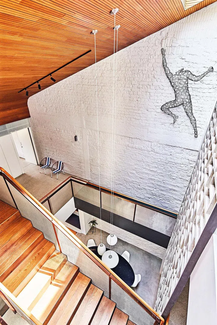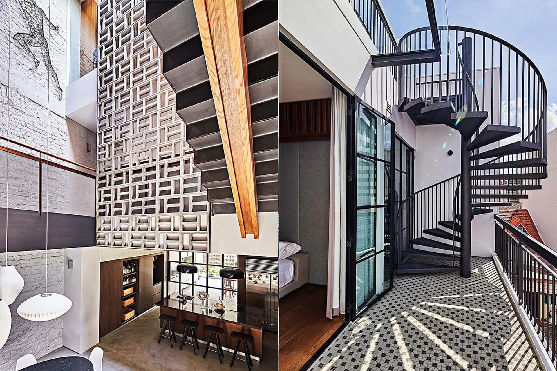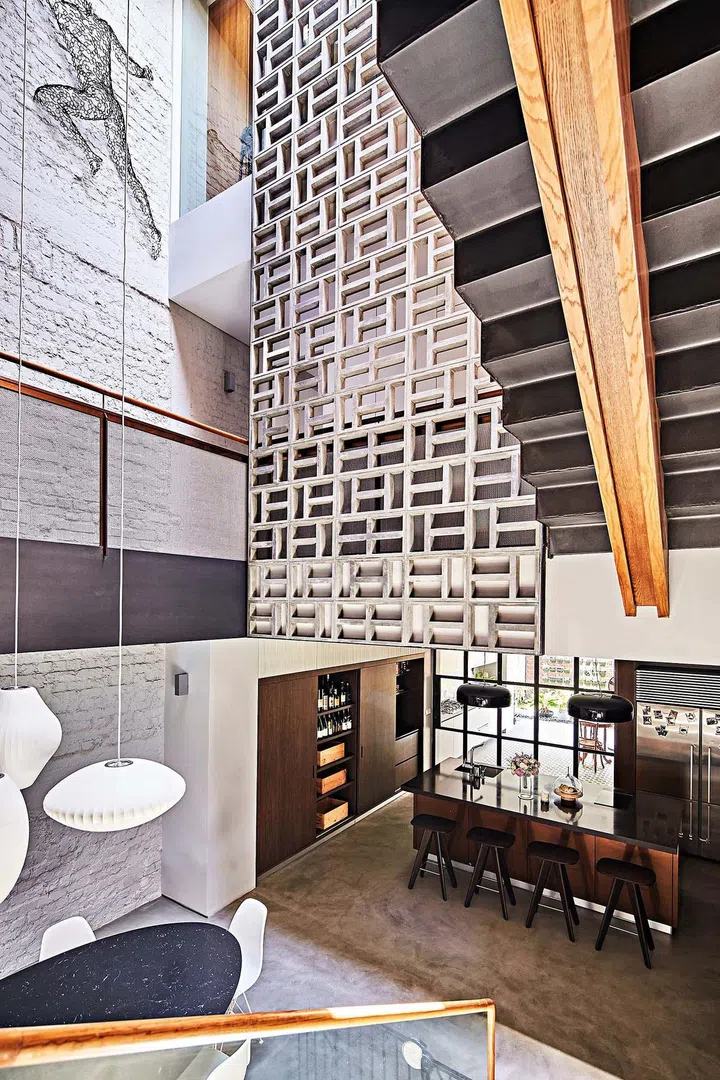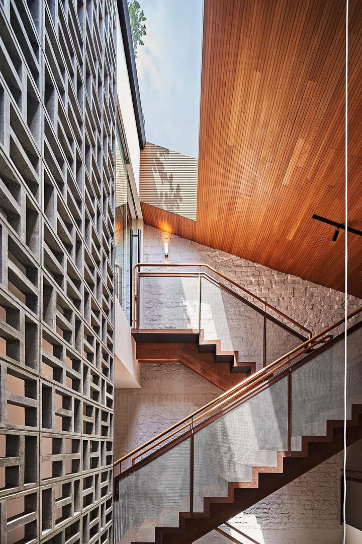 The most striking feature in the atrium is a screen of concrete vent blocks that stretches from the second to the third storey. Its design was inspired by the external facade of a block of old, walk-ups in the Joo Chiat area that Sier Han chanced upon.