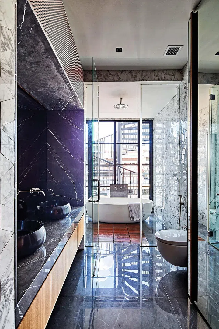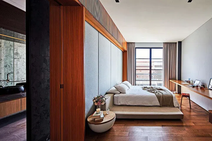 The master suite on the third storey is the couple’s sanctuary. A sliding glass door and fixed glass panels with blinds offer them the flexibility of moderating their desired level of privacy.