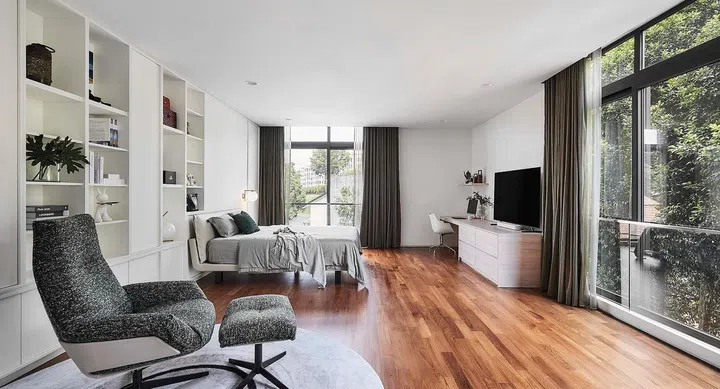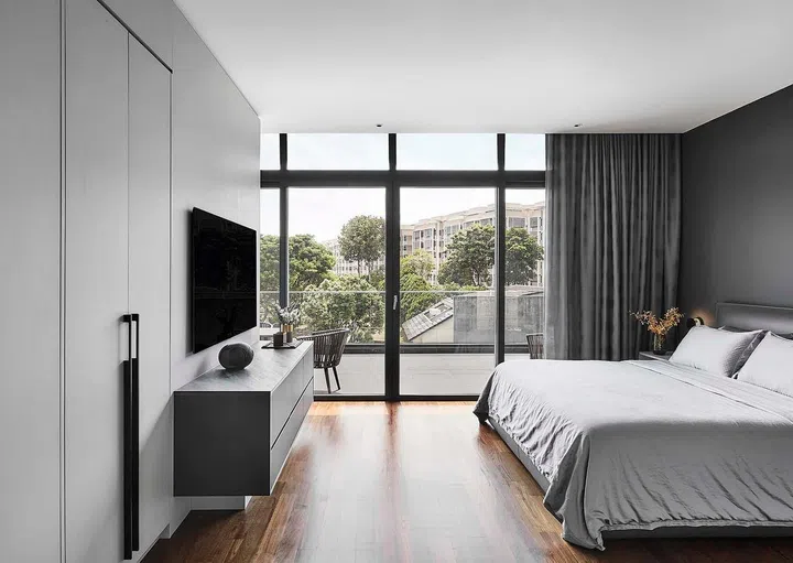Adjacent to the master bedroom is the daughter’s room, which enjoys views of verdant green through floor-to-ceiling windows. The bed and armchair have been oriented to maximise the appreciation of the lush foliage.