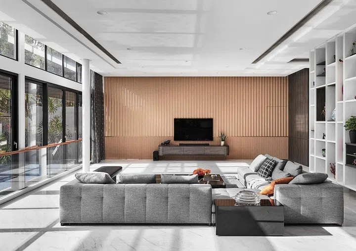 “We modified the ceiling height and added a full-height, floating bookshelf in front of the staircase. Besides creating a focal point within the expansive living and dining areas, it also disguises an existing column,” says principal designer Selina Tay.