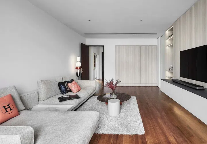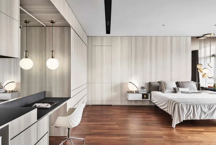 It is divided into four zones: sleeping area, study alcove, walk-in wardrobe and bathroom. The sleeping area was conceived as an intimate, cocoon-like space. The wall-mounted TV set and console, built-in cabinets and a hidden door leading to the bathroom are lined up along the wall facing the bed.