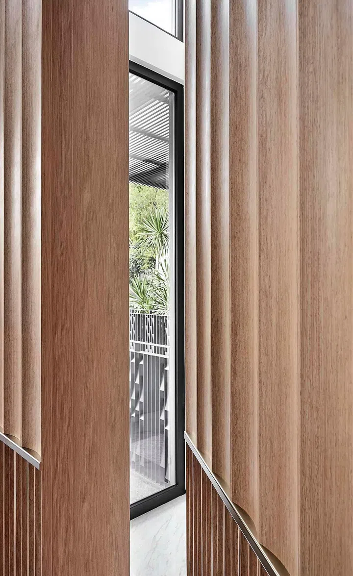 The feature wall’s vertical fluting, curved elements and subtle gold trim showcase the design team’s attention to detail, brought to life by impeccable carpentry.