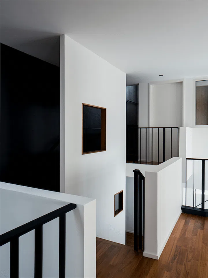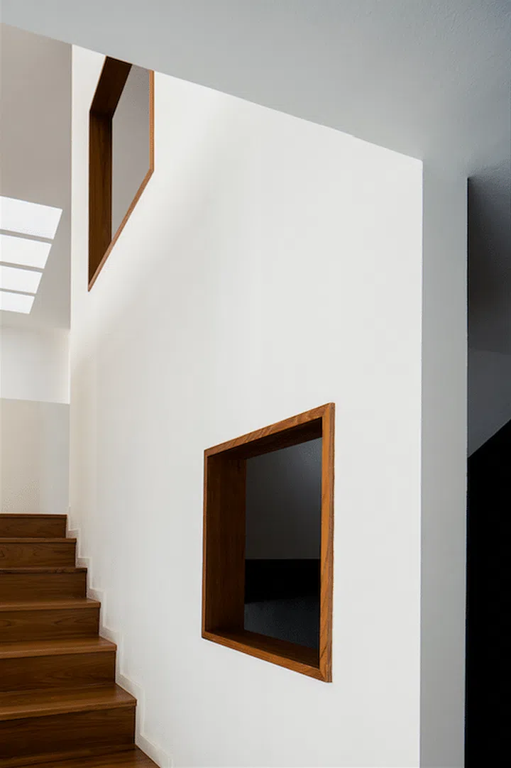 Cut-out frame designs are incorporated into the wall by the staircase to offer visual connection between spaces.