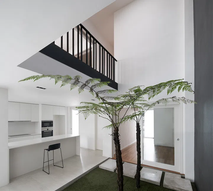 A covered courtyard sits in the centre of the house, and greenery is introduced into the interior space.