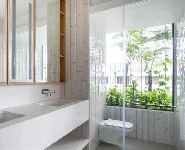 The master bathroom is situated at the space behind the headboard. White subway tiles are used here to add a textural effect, while plants add a splash of green into this intimate space.