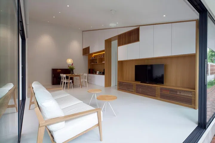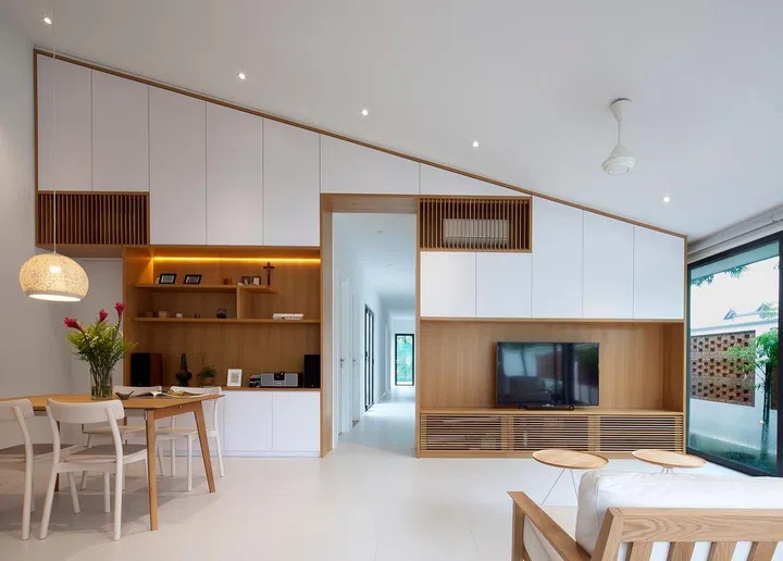 In the living and dining room, the pitched roof design of the house is accentuated by clever use of wood outlines along the perimeters of the feature wall cum display cabinet, TV console and storage space.