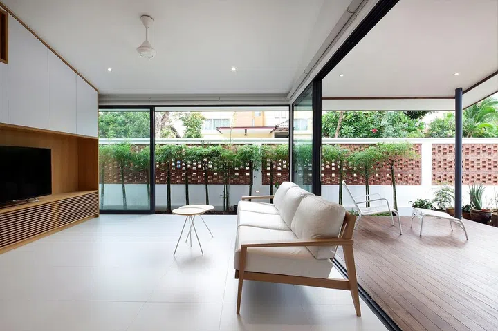 Designed by Atelier M+A, this single-storey corner terrace house is designed with very unique architectural language — a pitched-roof-inspired design is seen from the exterior to the interiors. Its design strays away from those of its neighbours — many of which tower three-storey high.