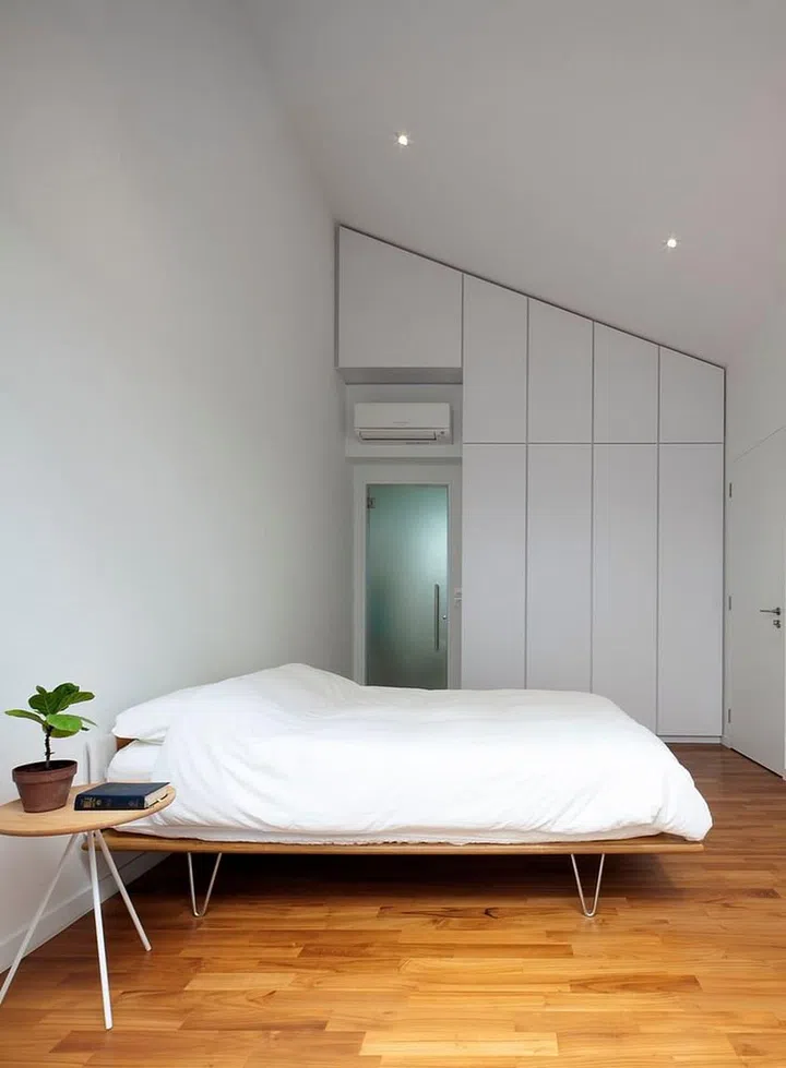 To add more storage space, the team designed full-height wardrobes in the bedroom. The white palette in this space keeps it looking bright and minimalist.