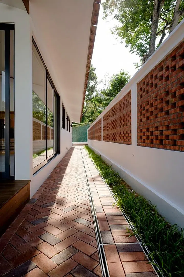With the architecture taking on very simple forms, the team at Atelier M+A decided to add visual effects by laying out bricks in the house and its façade to create patterns — the brick flooring at the corridor, which runs along the length of the house, showcases bricks laid in a herringbone fashion.