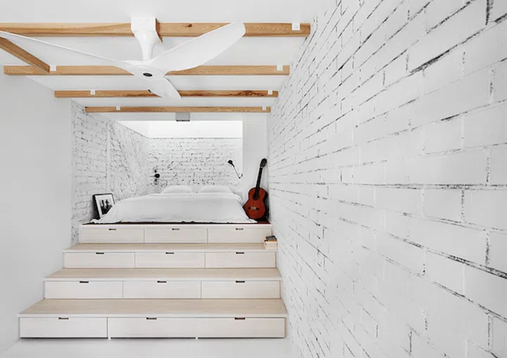 The super king-sized bed sits on an elevated alcove above a series of steps incorporating storage drawers.