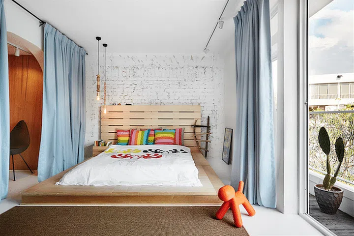 The futon placed on top of a custom-built solid pinewood and plywood pallet, together with an adjoining study alcove constructed entirely out of raw plywood, give the room a rustic and playful vibe.