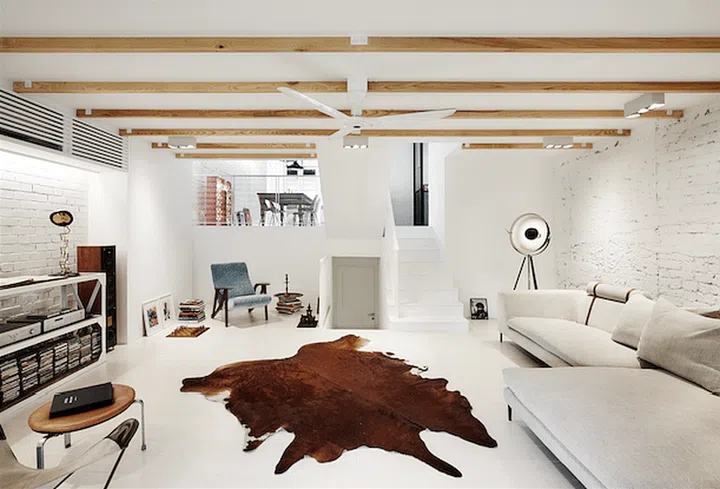 The smooth, white engineered wood flooring, the rough exposed brick wall that has been painted white, and the white canvas Wendelbo sofa imbue a richness to the white tapestry, articulated through the different textures.