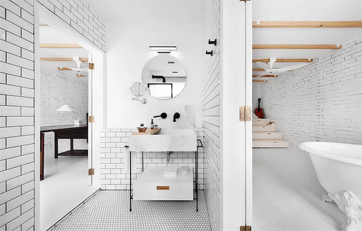 As with the rest of the house, the different textures of materials such as the white-painted exposed brick wall, white composite lumber plastic decking, ceramic mosaics and subway tiles add a complex dimension to a simple palette.