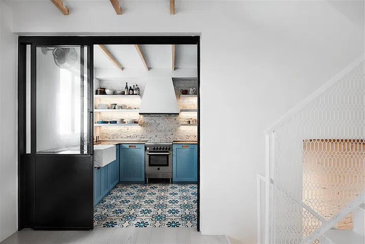 Blue cabinetry and bold patterned tiles in the kitchen make the space stand out against the white palette in the rest of the home.