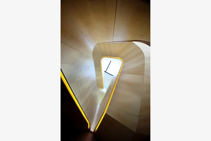 The straw-coloured wood panelling blend harmoniously with the gold track lighting to create a shimmering effect along the stairway.