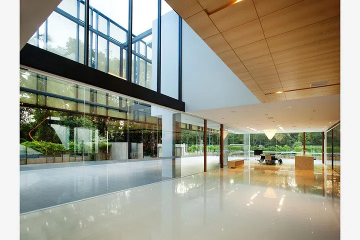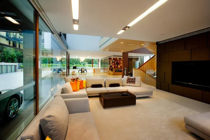 The full-length glass walls along three sides of the home on the ground floor allow the interiors to flow seamlessly into the outdoors while still keeping the space comfortably air-conditioned.