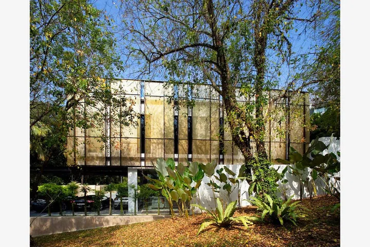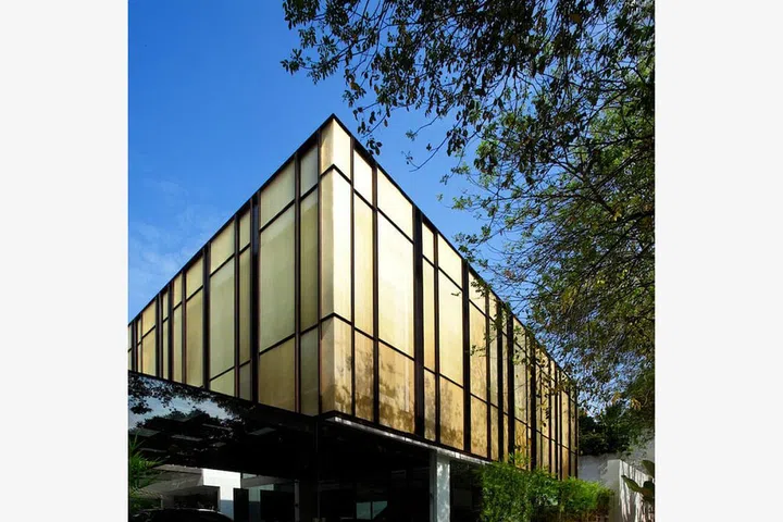 From a distance, this house looks like a shiny gold parcel glittering in the sun. The gold mesh panels of its façade, combined with the sand-coloured stone fence, make the house look impressive and imposing.
