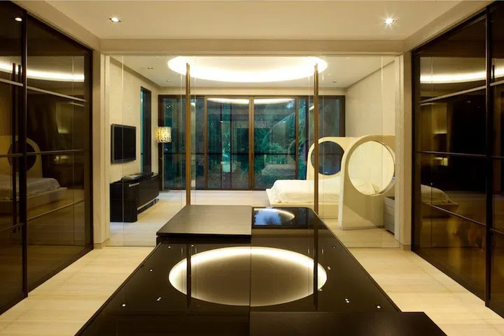 In the bedroom, the sleeping area is demarcated with a cream colour palette while the walk-in wardrobe is designed with black panels.