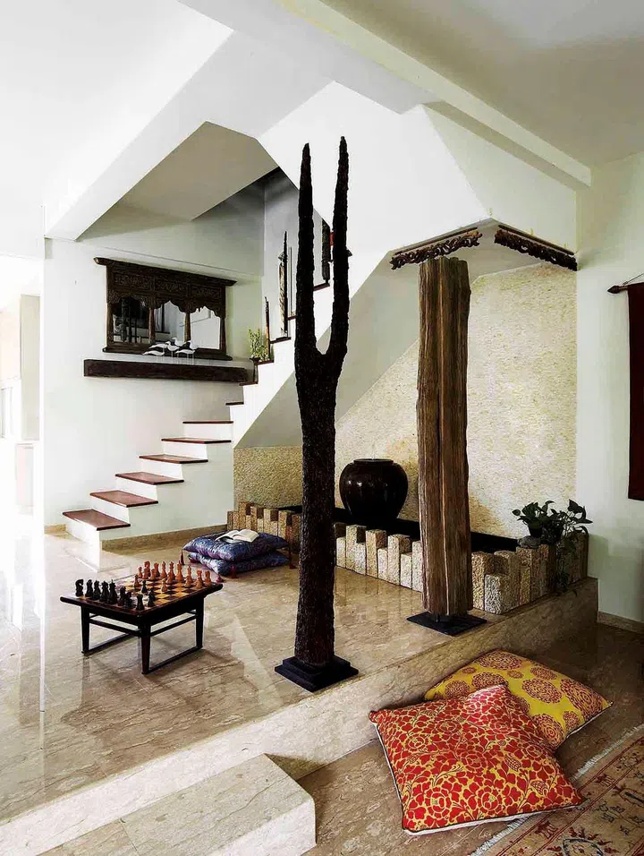 A storeroom under the staircase was demolished and turned into a water feature, bringing some welcome texture and softness.