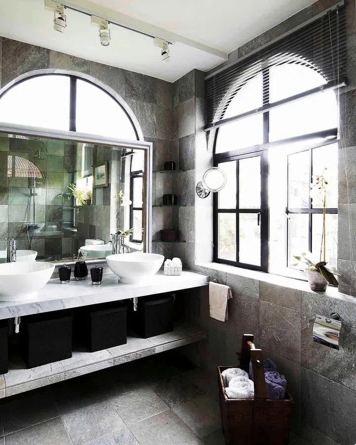 The arched windows lend a stately, old-world air to the new bathroom. Toiletries are kept in baskets stowed below the marble vanity top. An old wooden bucket from China holds towels.
