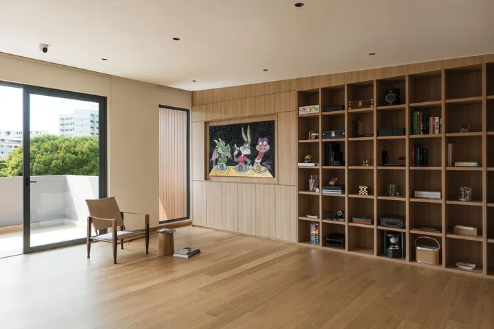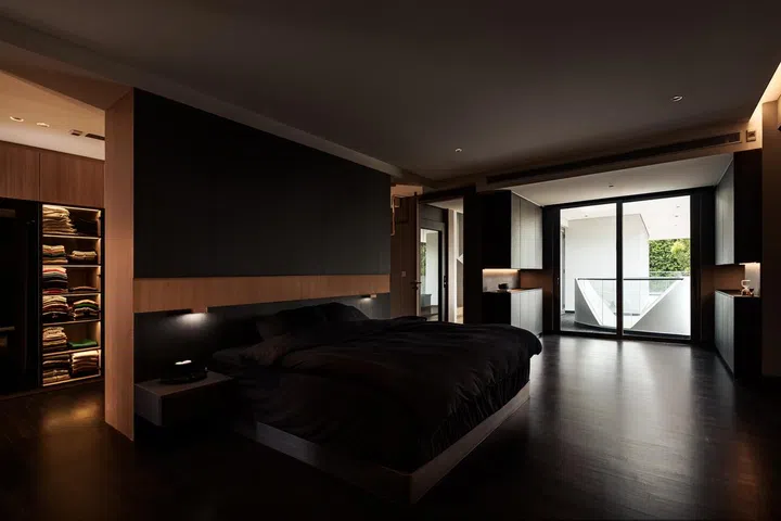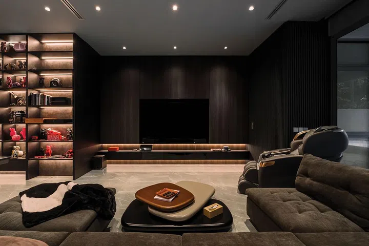 Pandering to this part of the brief, Tan saw to a substantially sized entertainment room (pictured above) on the lower floor. There, the tone converts back to being brooding, courtesy of carpentry wrapped in a laminate named Anthracite Eames Teak.