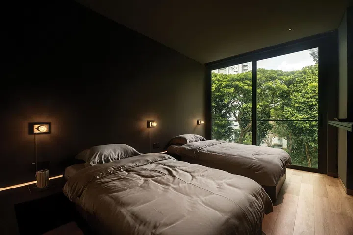 That said, tired guests are welcomed on the second floor too, with three rooms set aside for them located there. All bear the minimalist style but with subtle differences, such as one with twin beds that has a deliberately muted gunmetal-grey feature wall that accentuates the framed view of the tree canopy outside the glass doors.