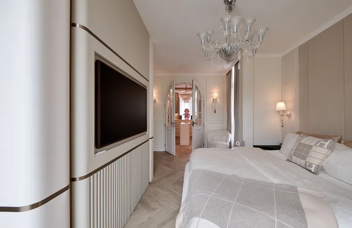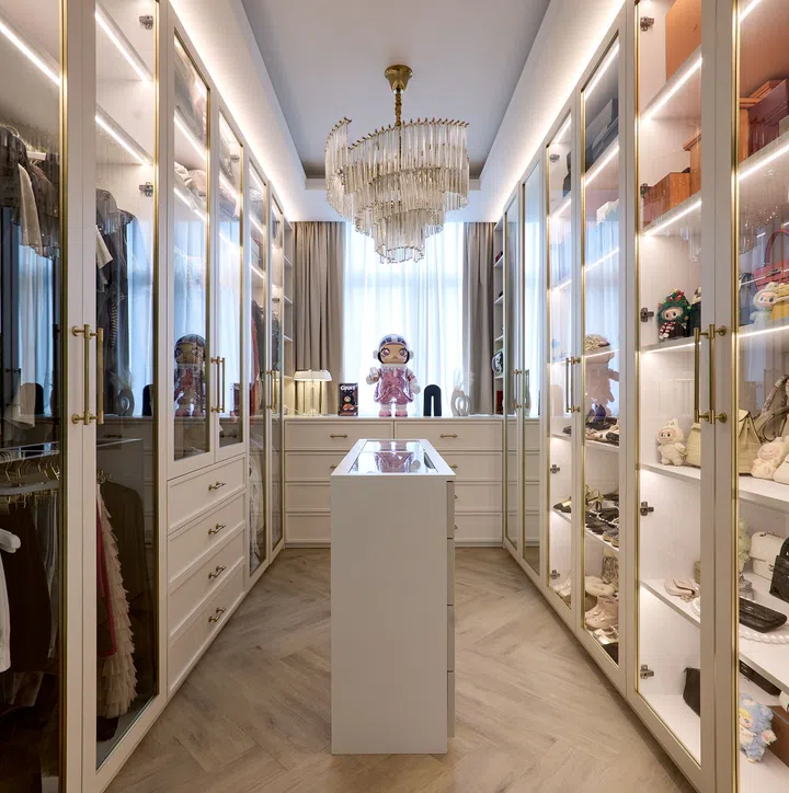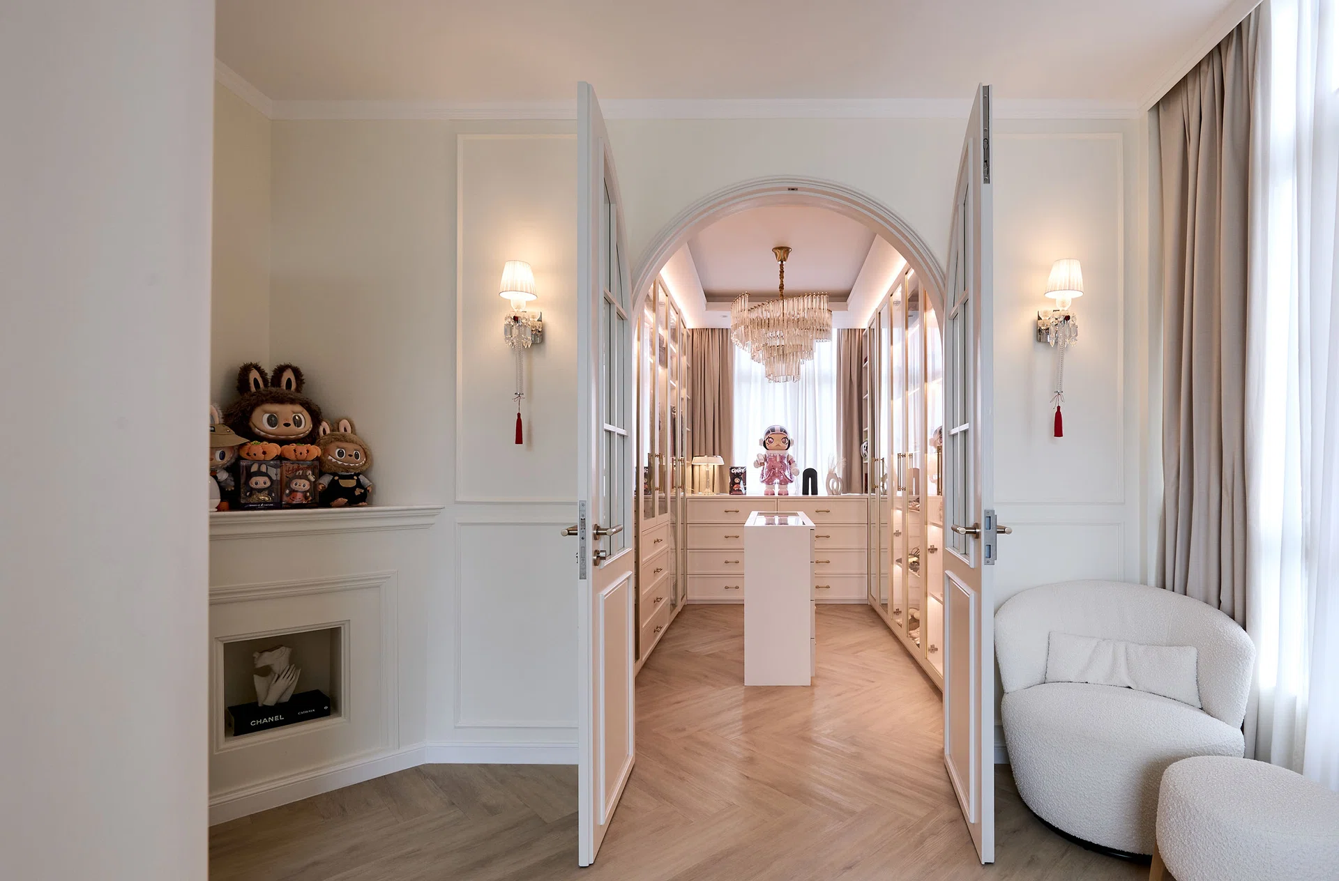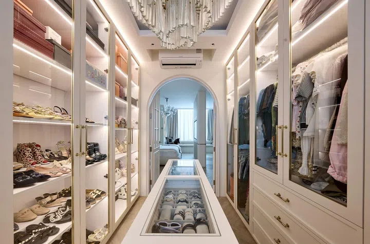Access to the walk-in wardrobe is through a pair of arched French doors on one side of the master bedroom. The walls are lined with wardrobes, drawers and shelves that provide ample room for the couple’s clothes, handbags and accessories.