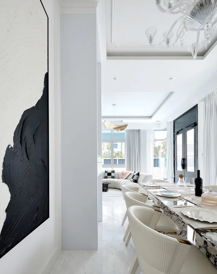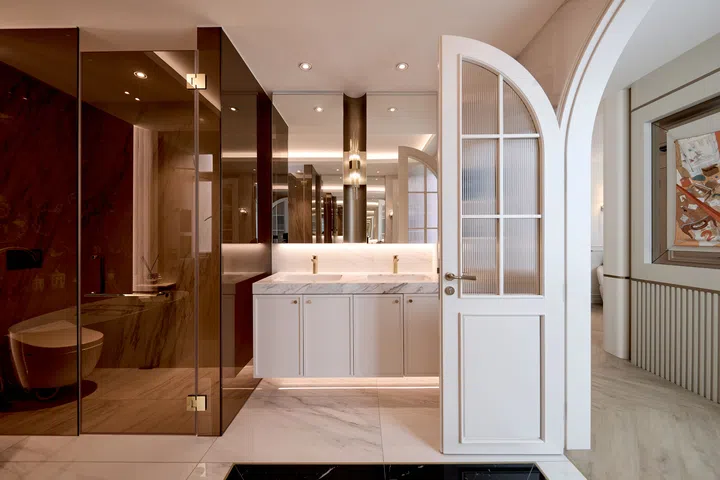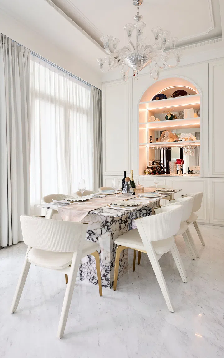 A display niche with a French arc and mirrored backdrop beside the dining table reflects the modern French style of the home interior. The pantry area incorporates concealed storage behind walls with French mouldings. The French theme is also evident in the living room with Venus white marble complemented by mouldings, cornices, black fluted panels and gold trims.