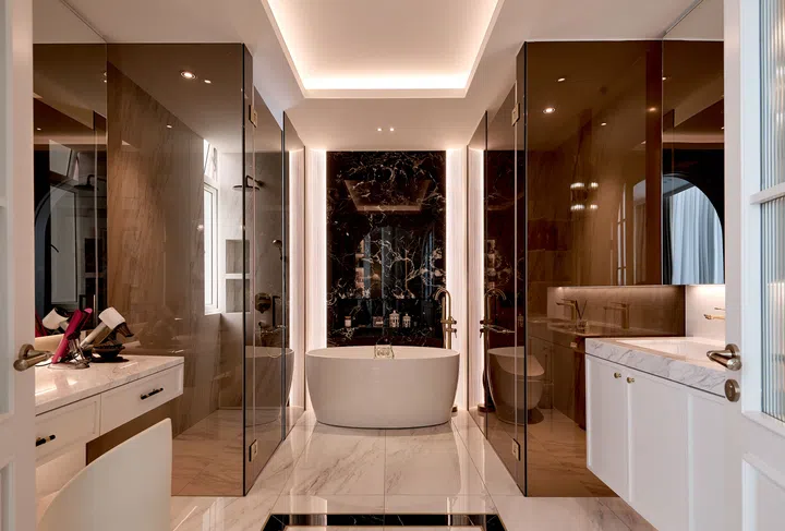 The selection of laminates and the placement of French mouldings on each wall and door reveal just how exacting the couple was when it came to the carpentry. For the master bathroom, they even went to the extent of selecting handles with a dark coloured marble finish for the drawers on one side of the bathroom vanity to complement the Volakas and White Portoro marble.