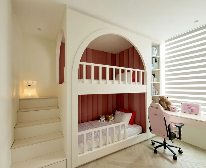 The girls share a bedroom with two bunk beds whose design marries whimsy and timelessness, something that they can still appreciate even when they are older. The arch motif ties in with the rest of the home and a soft, L-shaped headboard in a blush pink adds just a touch of princess femininity.