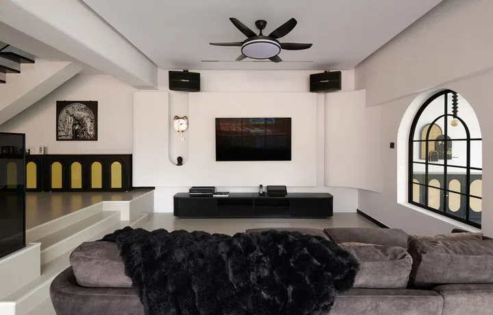 The living room stays true to the black and white theme with its white walls, black television console and an arched window opening with black frames that looks out to the car porch.